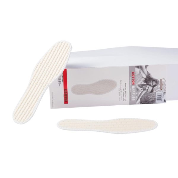 Mit diesen Einlegesohlen aus 100% luftiger Baumwolle ist angenehmes und hautfreundliches Barfußlaufen im Schuh garantiert. Während die Baumwolle den Fuß kühlt, sorgt der der perforierte Latexkörper für Luftdurchlässigkeit. Dadurch eignen sich die Einlegesohlen ideal für den Sommer. Zugleich wird der Fuß gepolstert und durch das Rillenprofil das Rutschen im Schuh verhindert. Die Einlegesohlen sind handwaschbar bei 30° Celsius.